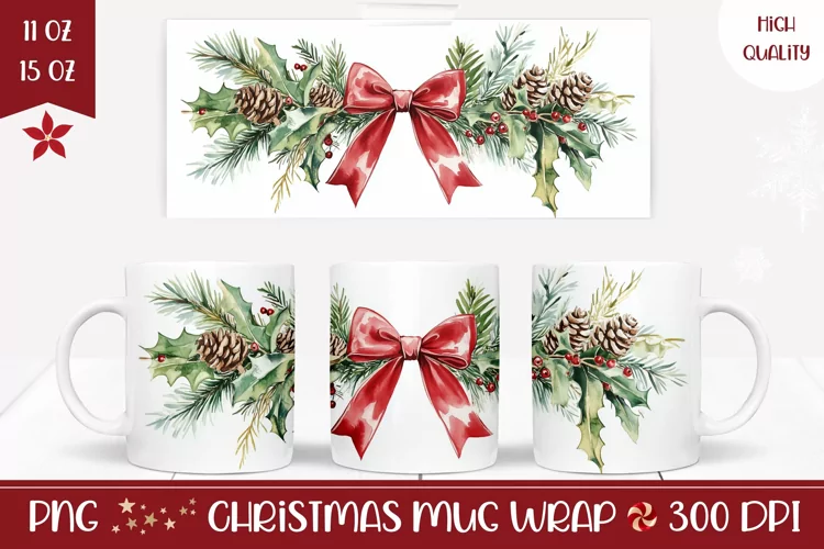 Christmas Tree Branch Mug Design, Ribbon Mug Template
