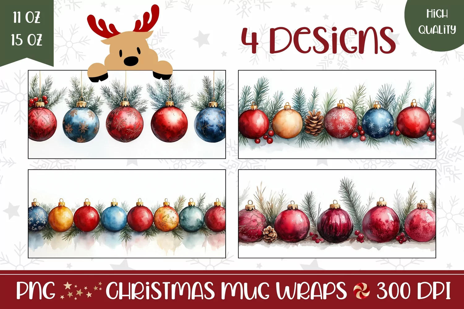 Watercolor Christmas Mug Wrap, Christmas Baubles Mug Design