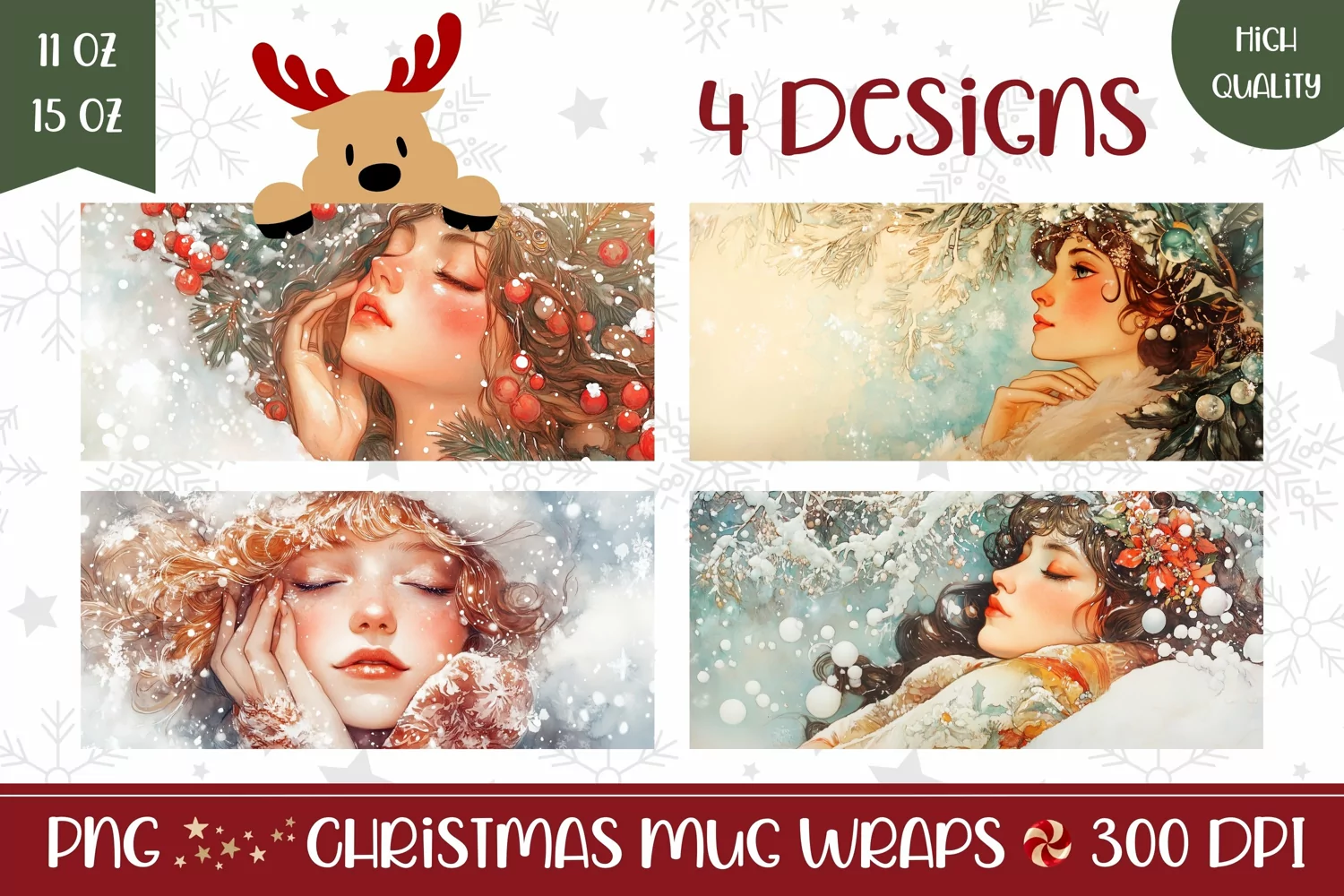Watercolor Christmas Mug Design, Winter Woman Mug Wrap