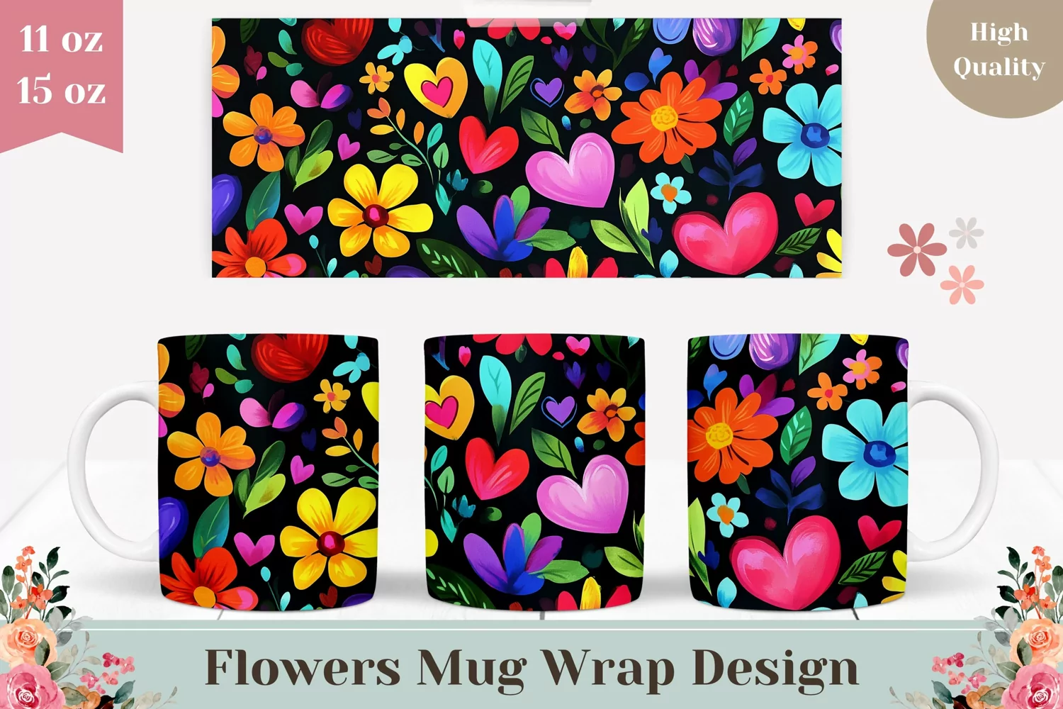 Cartoon Flowers Mug Wrap, Love Hearts Mug Sublimation PNG example image 1