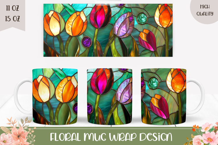 Stained Glass Flowers Mug Wrap, Tulips Mug Sublimation