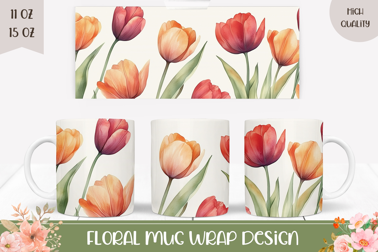 Flowers Mug Wrap, Watercolor Tulips Mug Sublimation example image 1