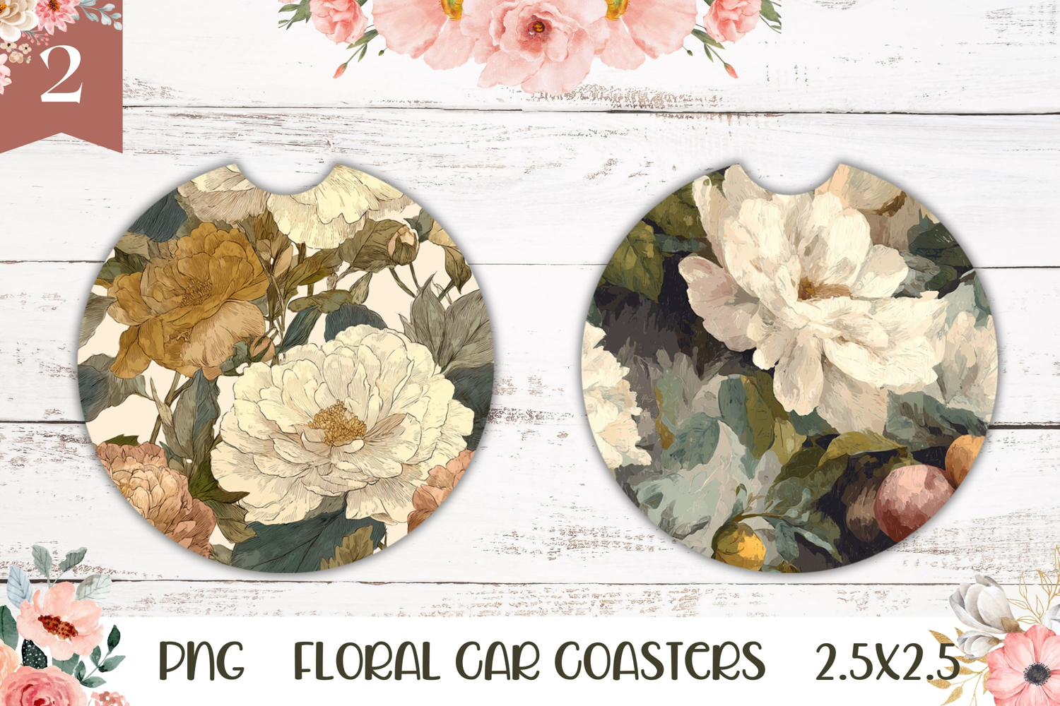 Flowers Car Coaster Sublimation Designs. Easy to size to your coasters diameter for sublimation.