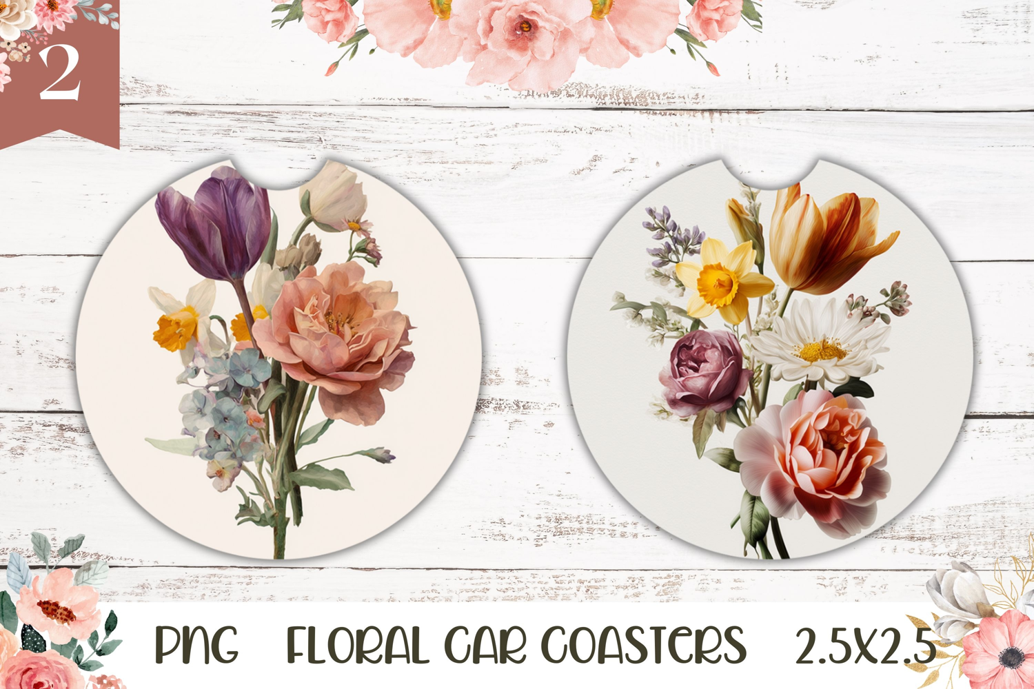 Flowers Car Coaster Sublimation Designs. Easy to size to your coasters diameter for sublimation.