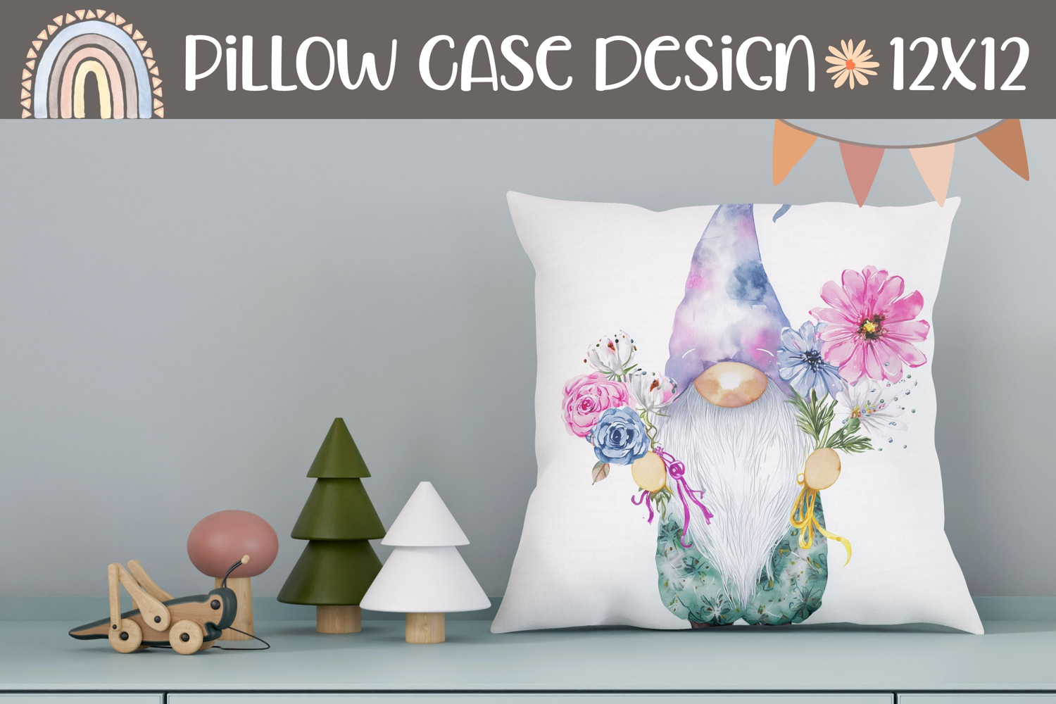 Watercolor Gnome Pillow, Floral Pillow Sublimation