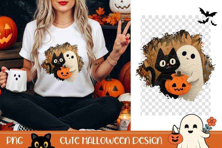 Halloween Black Cat PNG, Cartoon Halloween Ghost T-Shirt PNG example image 1