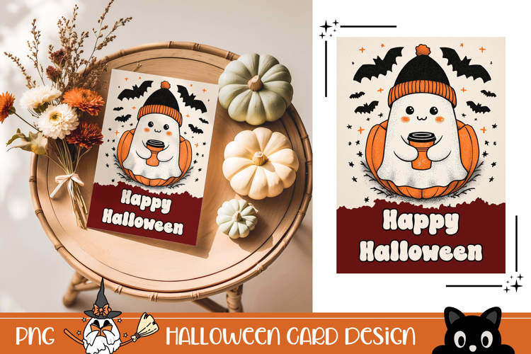 Happy Halloween Greeting Card Design, Cartoon Ghost PNG example image 1