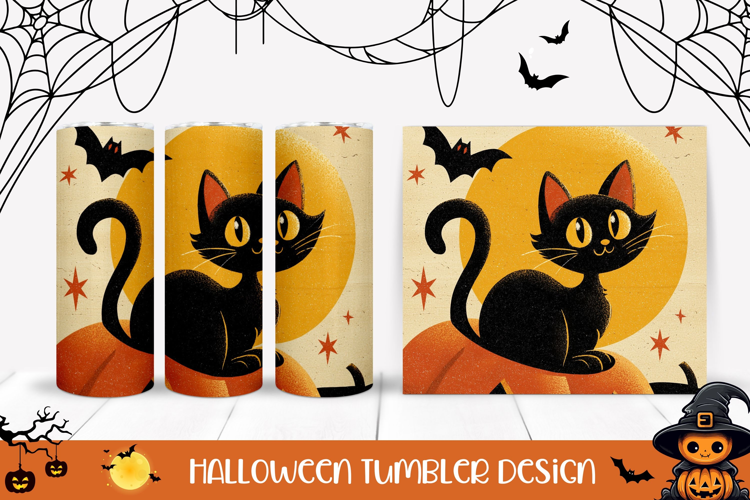 Vintage Halloween Black Cat Tumbler, Cartoon Bats Tumbler example image 1