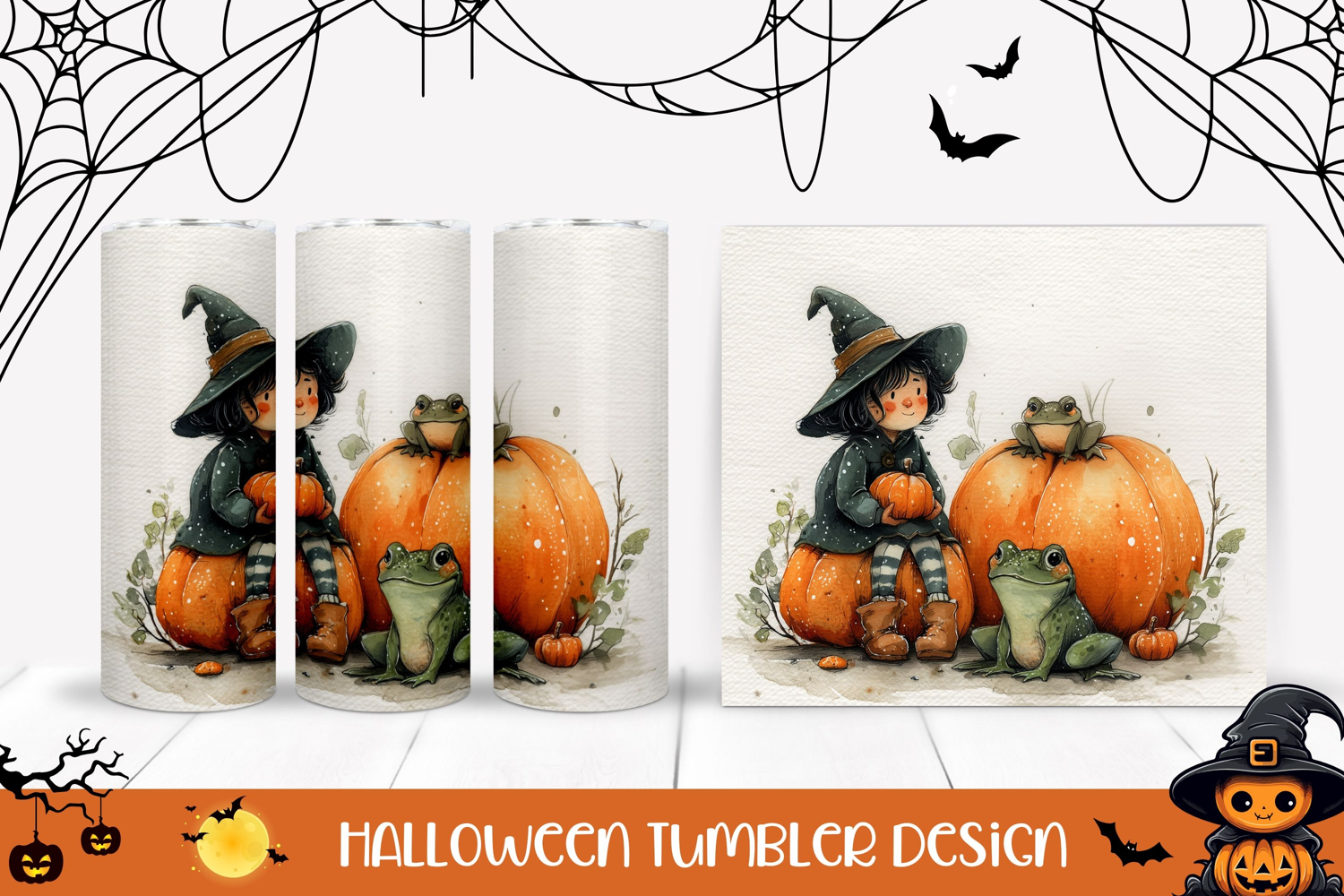 Cartoon Witch Tumbler, Watercolor Halloween Pumpkin Tumbler example image 1