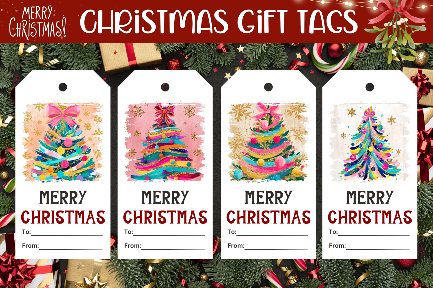 Abstract Christmas Tree Gift Tags, Pink Christmas Tags