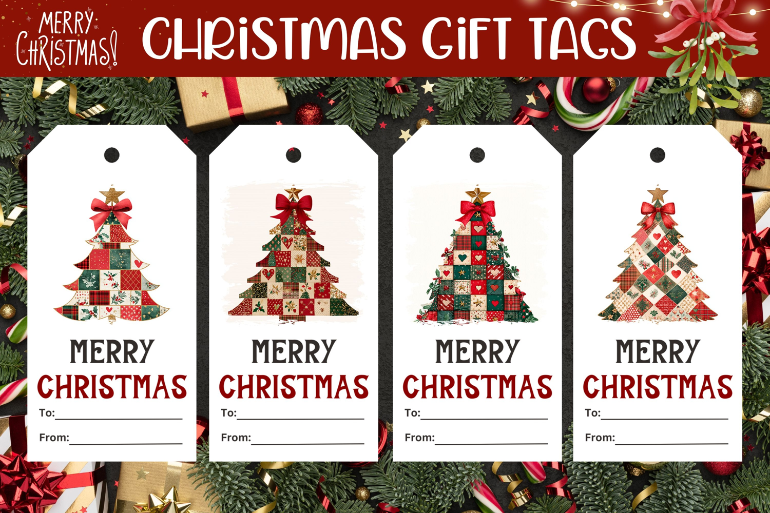 Patchwork Christmas Tree Gift Tags, Christmas Tags Printable