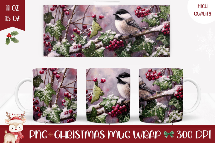 Cartoon Christmas Bird Mug Design, Winter Berries Mug Wrap example image 1