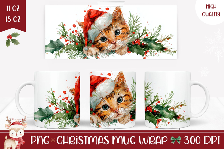 Watercolor Christmas Cat Mug Wrap, Christmas Animals Mug example image 1