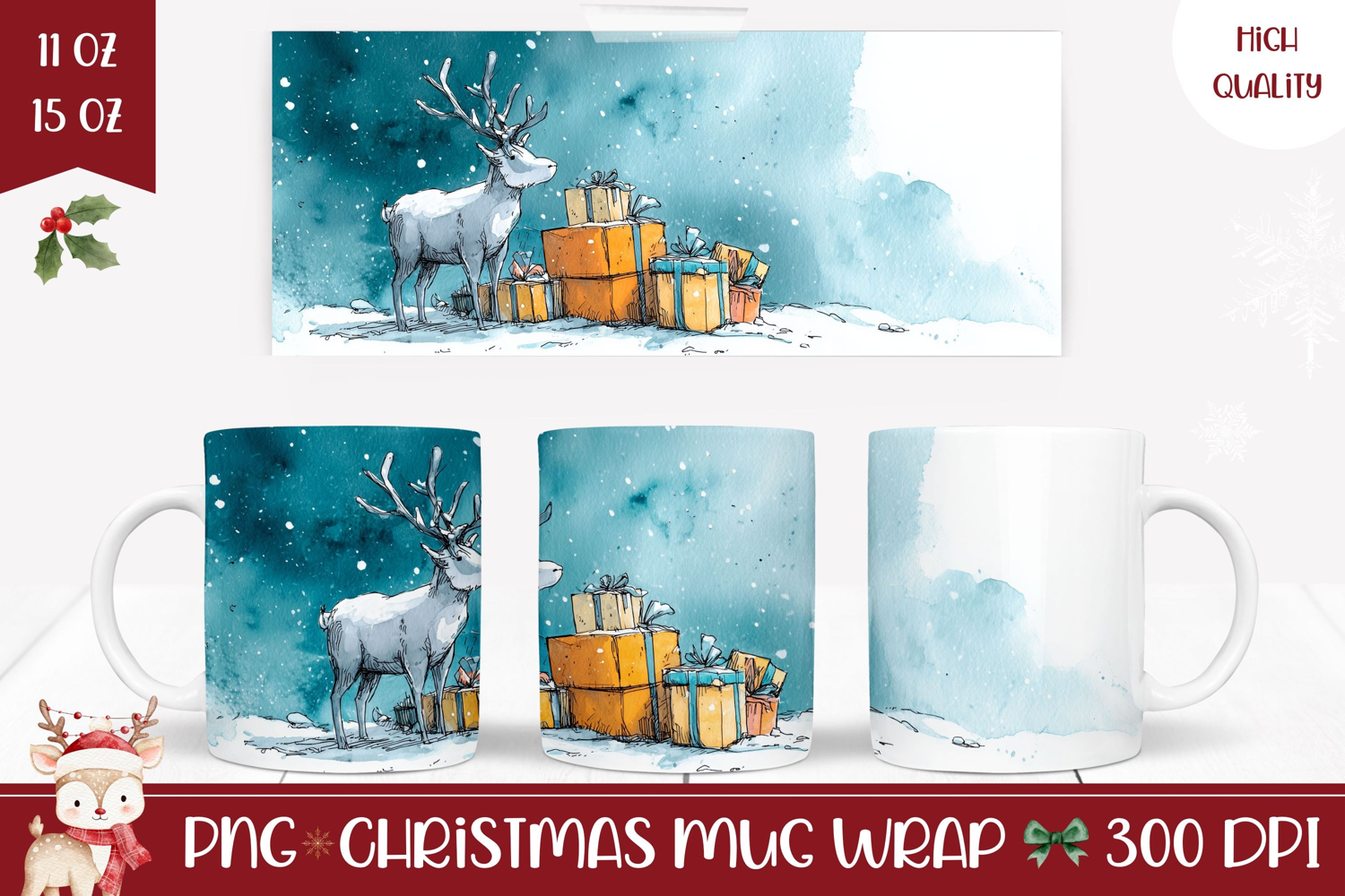 Watercolor Christmas Deer Mug Wrap, Christmas Animals Mug