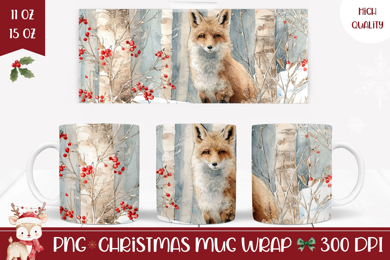 Watercolor Christmas Fox Mug, Winter Forest Mug Template