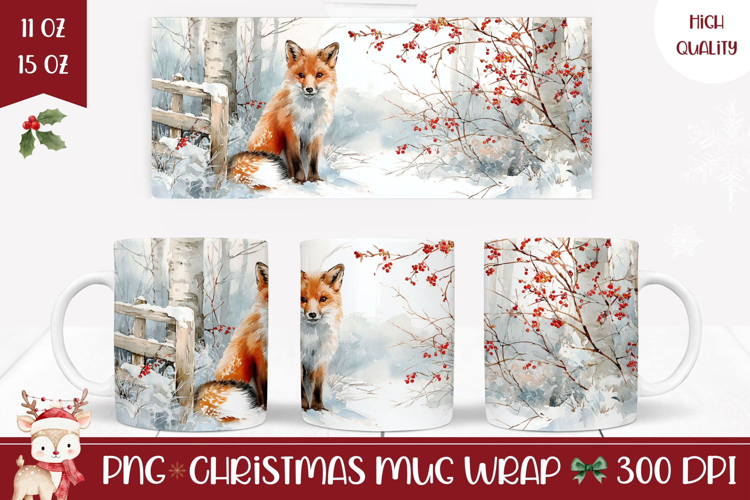 Watercolor Winter Fox Mug, Winter Forest Mug Sublimation