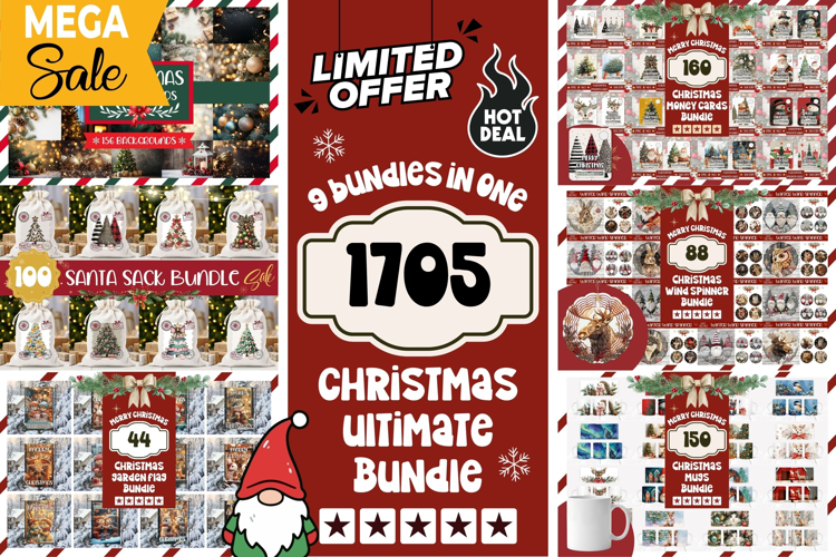 This HUGE bundle includes 1705 designs which can be used for many purposes specially on mugs, cards, scrapbooking, money cards, garden flags, wind spinners, santa sack.