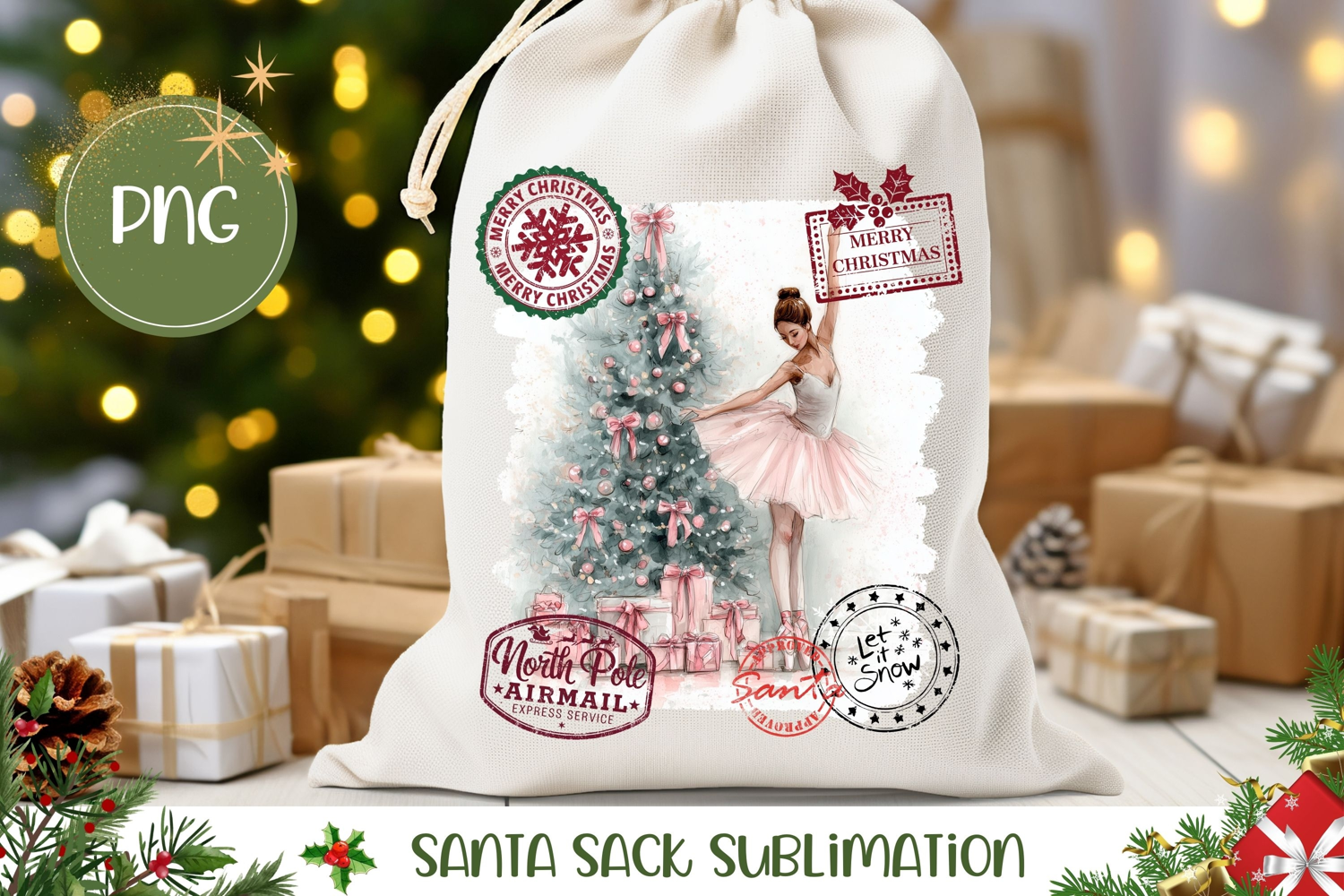 Pink Christmas Santa Sack, Christmas Ballerina Sublimation
