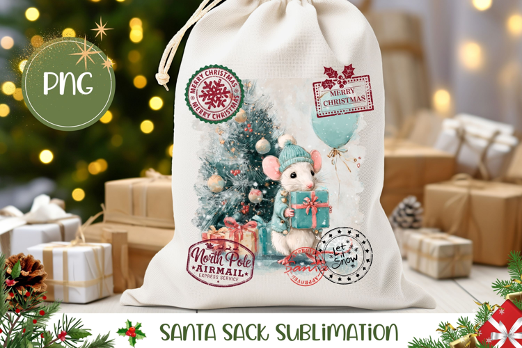 Watercolor Christmas Mouse Santa Sack, Mouse Sublimation