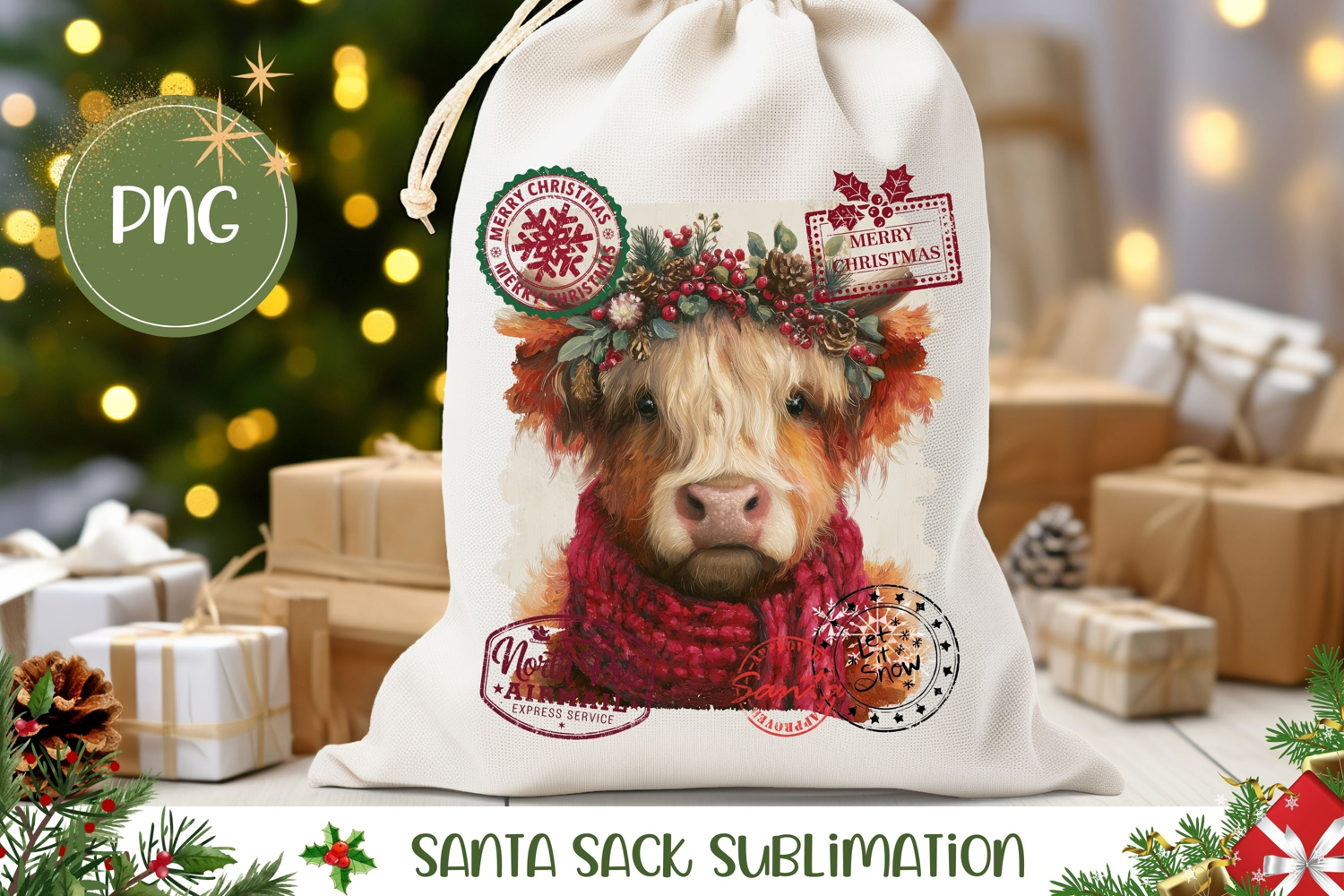 Similar Design Products to Highland Cow Santa Sack Template, Cute Gift Bag Design