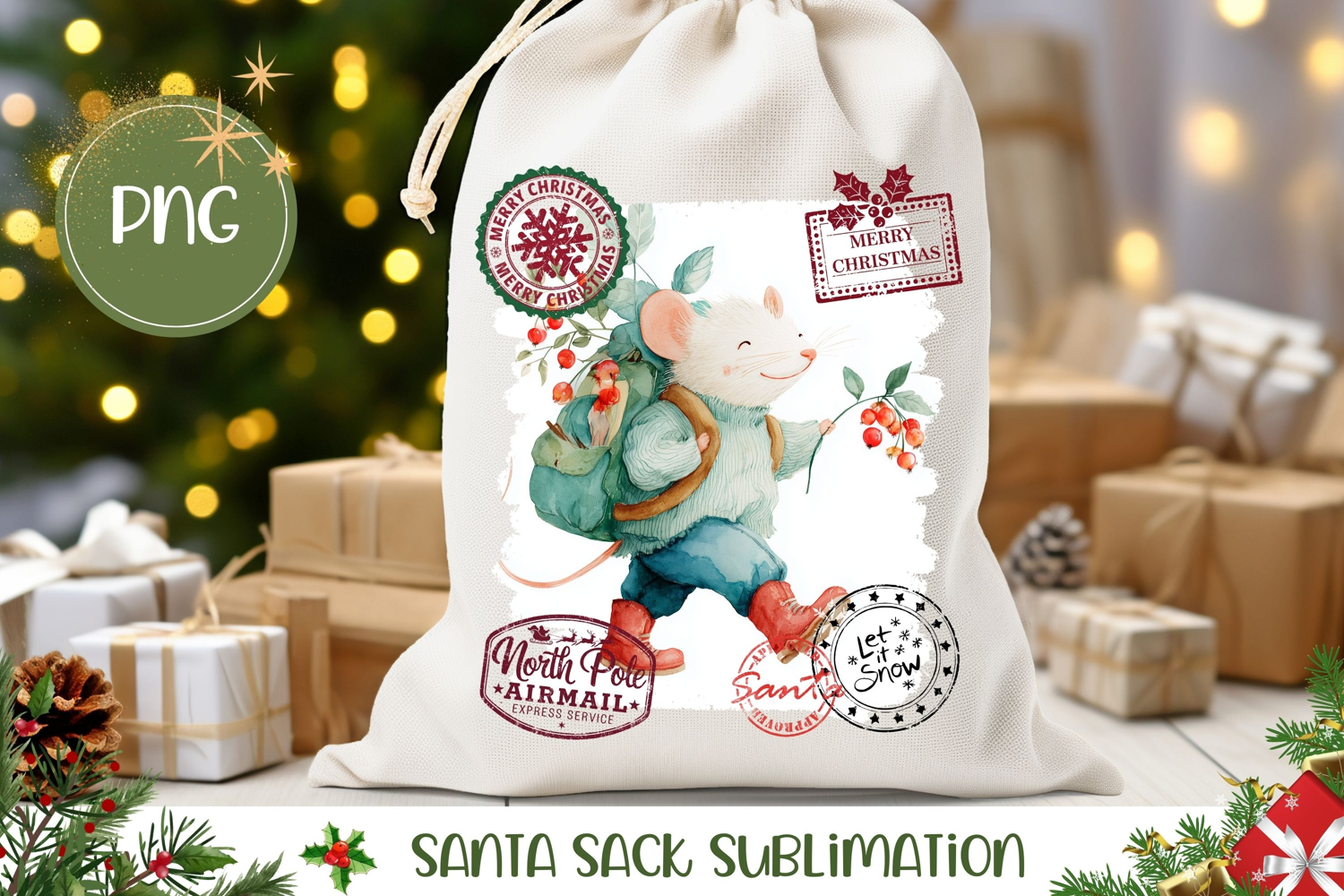 Similar Design Products to Watercolor Christmas Mouse Santa Sack, Christmas Mouse PNG