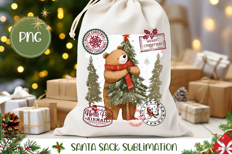 Christmas Bear Santa Sack PNG, Christmas Tree Gift Bag example image 1