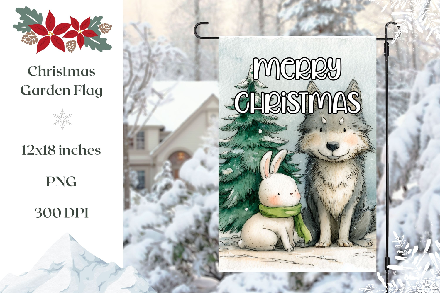Merry Christmas Garden Flag PNG, Winter Wolf Sublimation