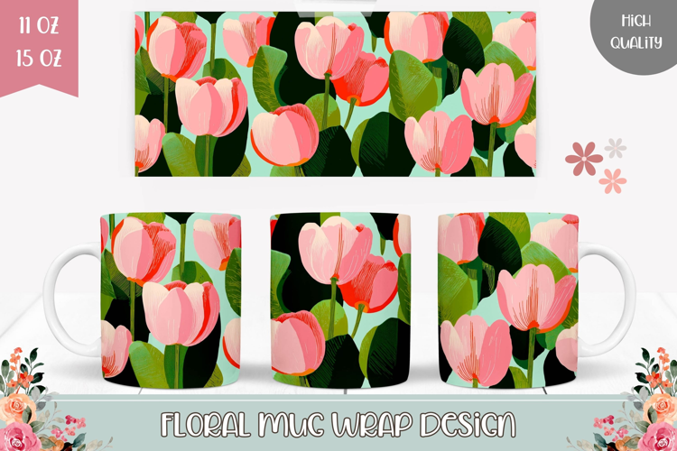 Pink Tulips Mug Wrap, Pink Flowers Mug, Floral Mug Design
