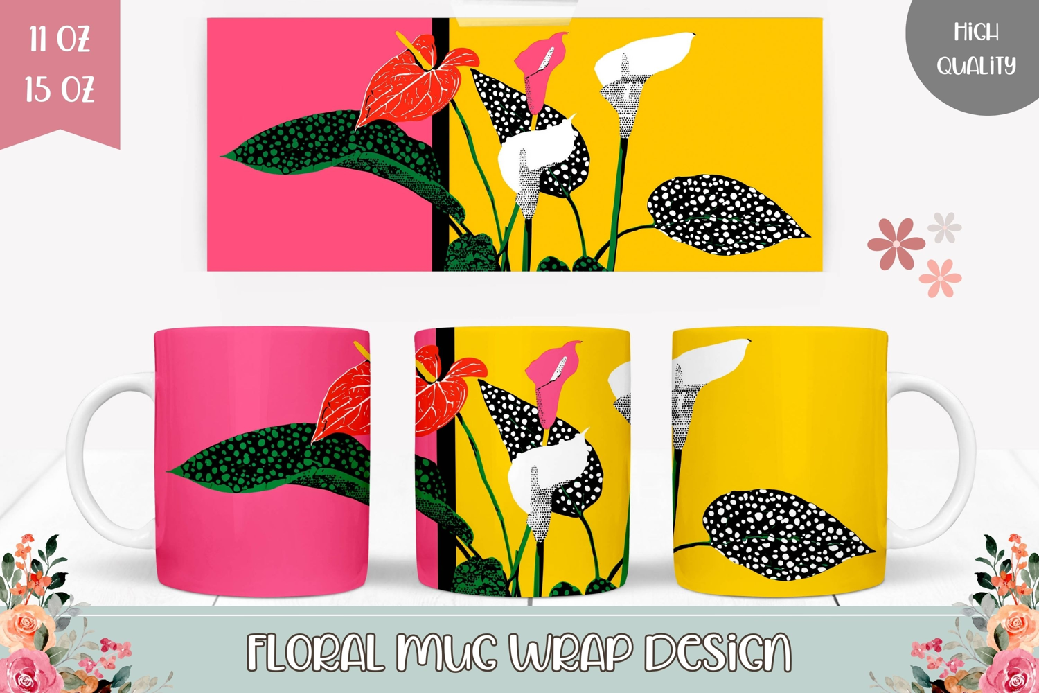 Pop Art Flowers Mug Wrap, Floral Mug Sublimation Design