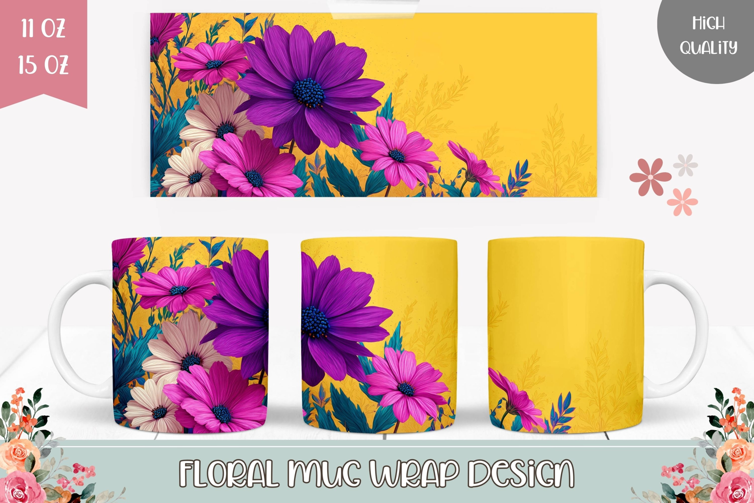 Purple Flowers Mug Template, Yellow Mug Sublimation Design