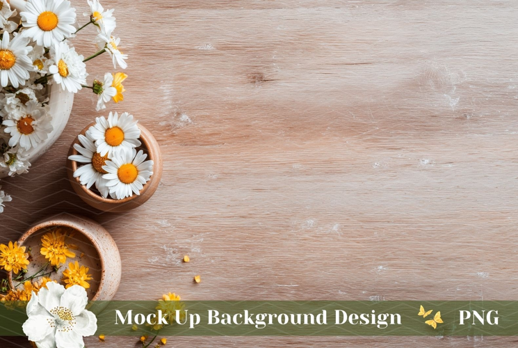 Flowers Background Mockup, Wooden Table Background PNG example image 1