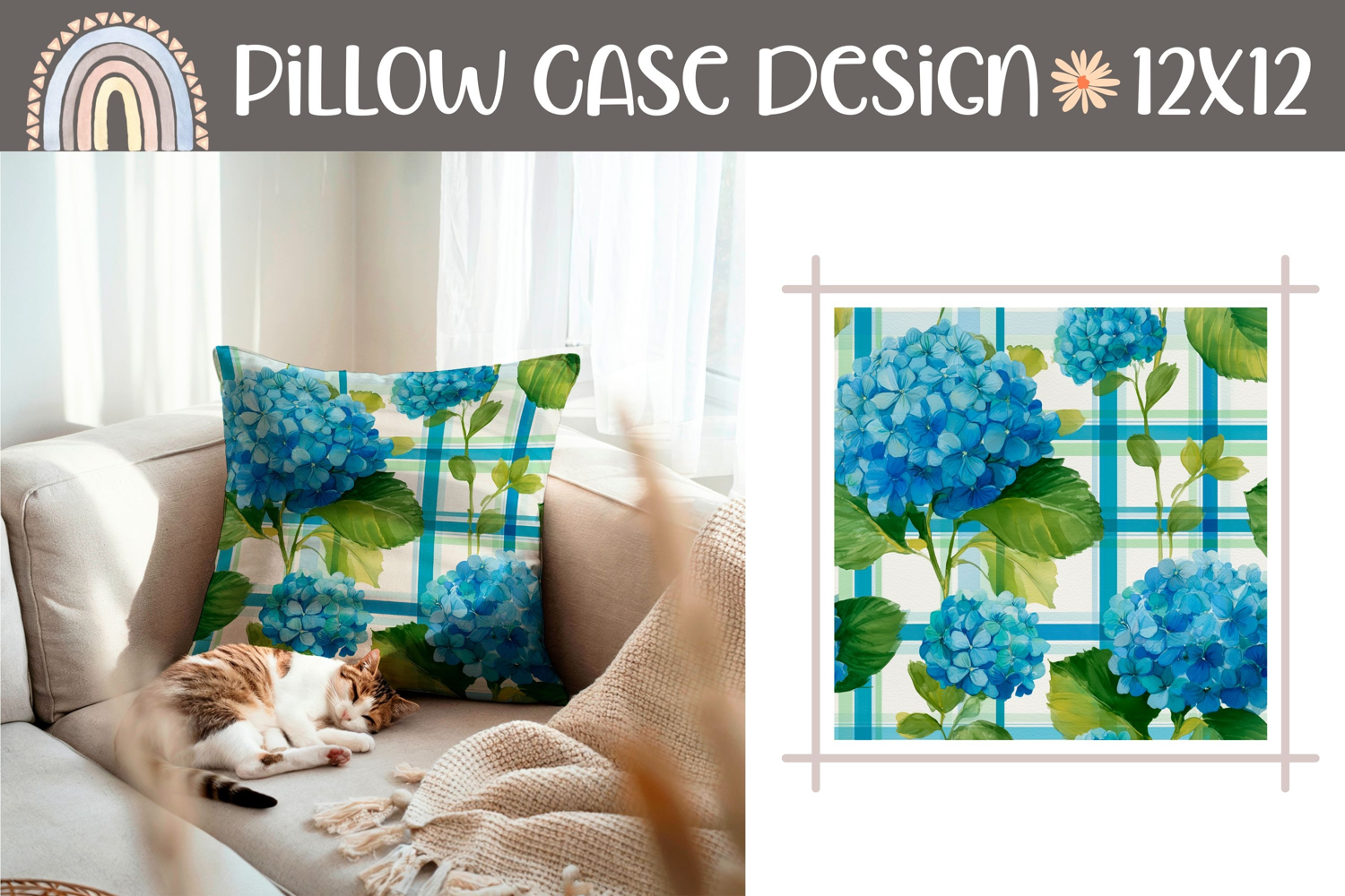 Blue Hydrangea Pillow Template, Floral Pillow Case Print