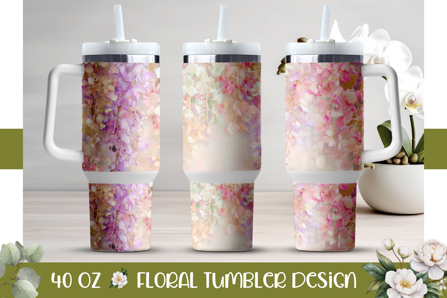 Wisteria Tumbler Design, Pink Flowers 40 Oz Tumbler Wrap