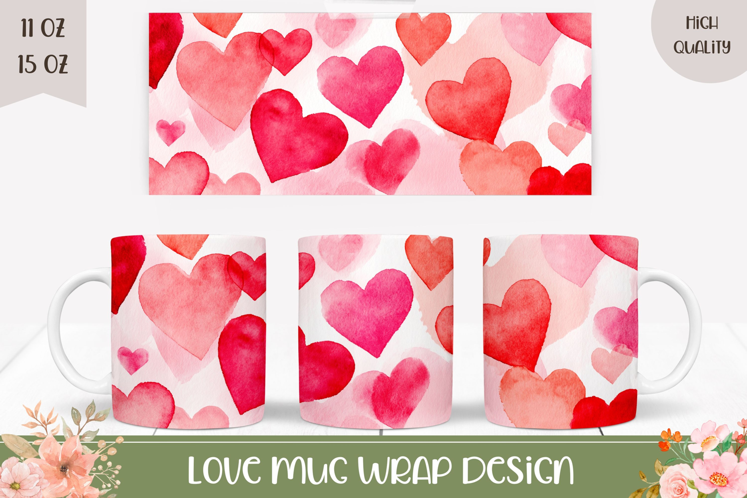 Watercolor Love Hearts Coffee Mug Wrap, Love Mug Template example image 1