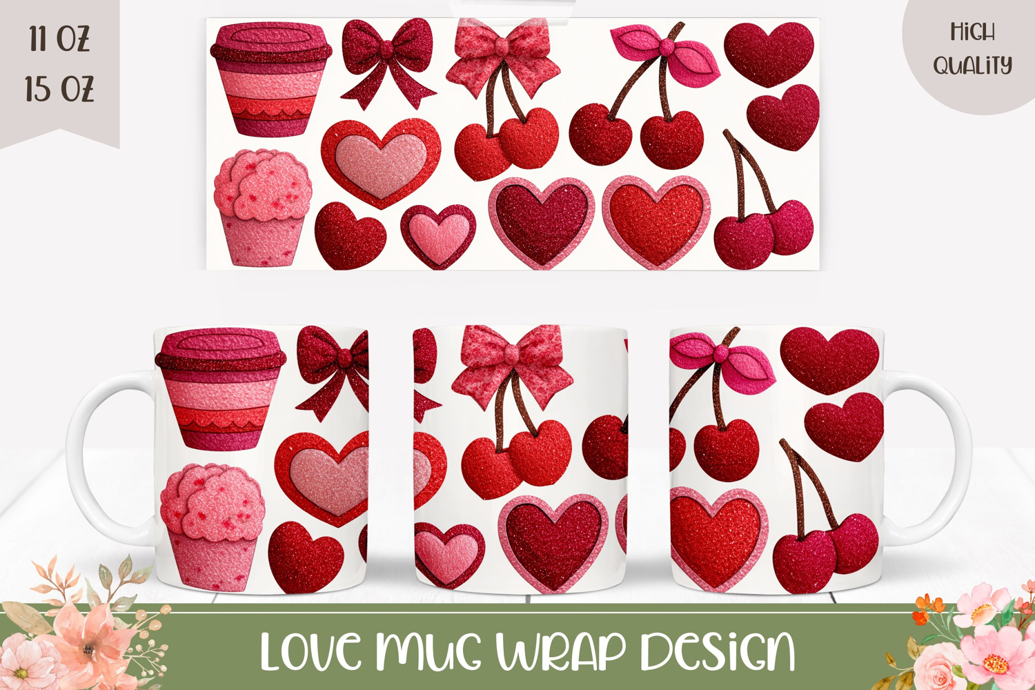 Cartoon Love Hearts Mug Design, Cherry Mug Sublimation