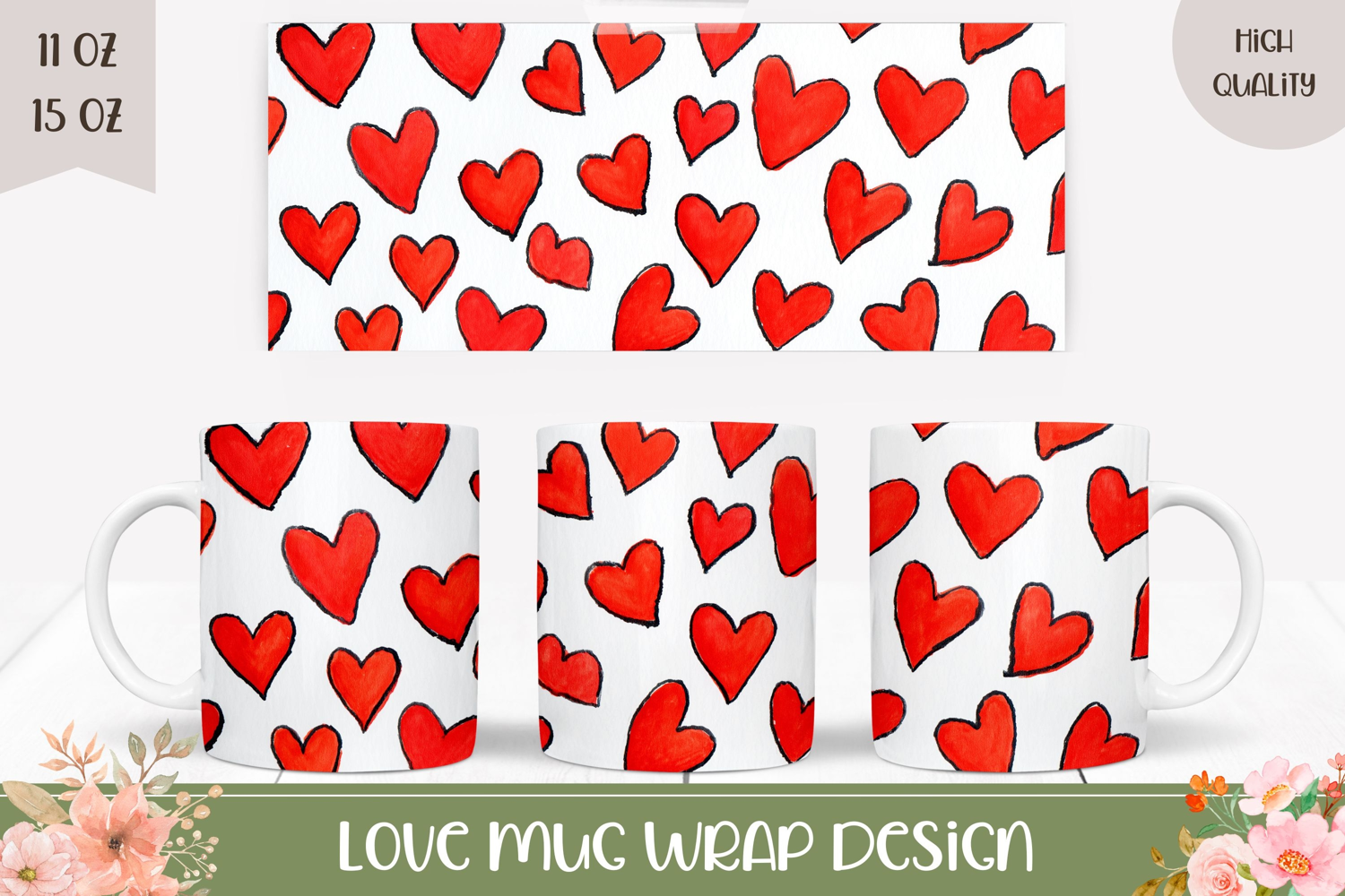 Love Hearts Mug Wrap Design, Valentines Day Mug Template