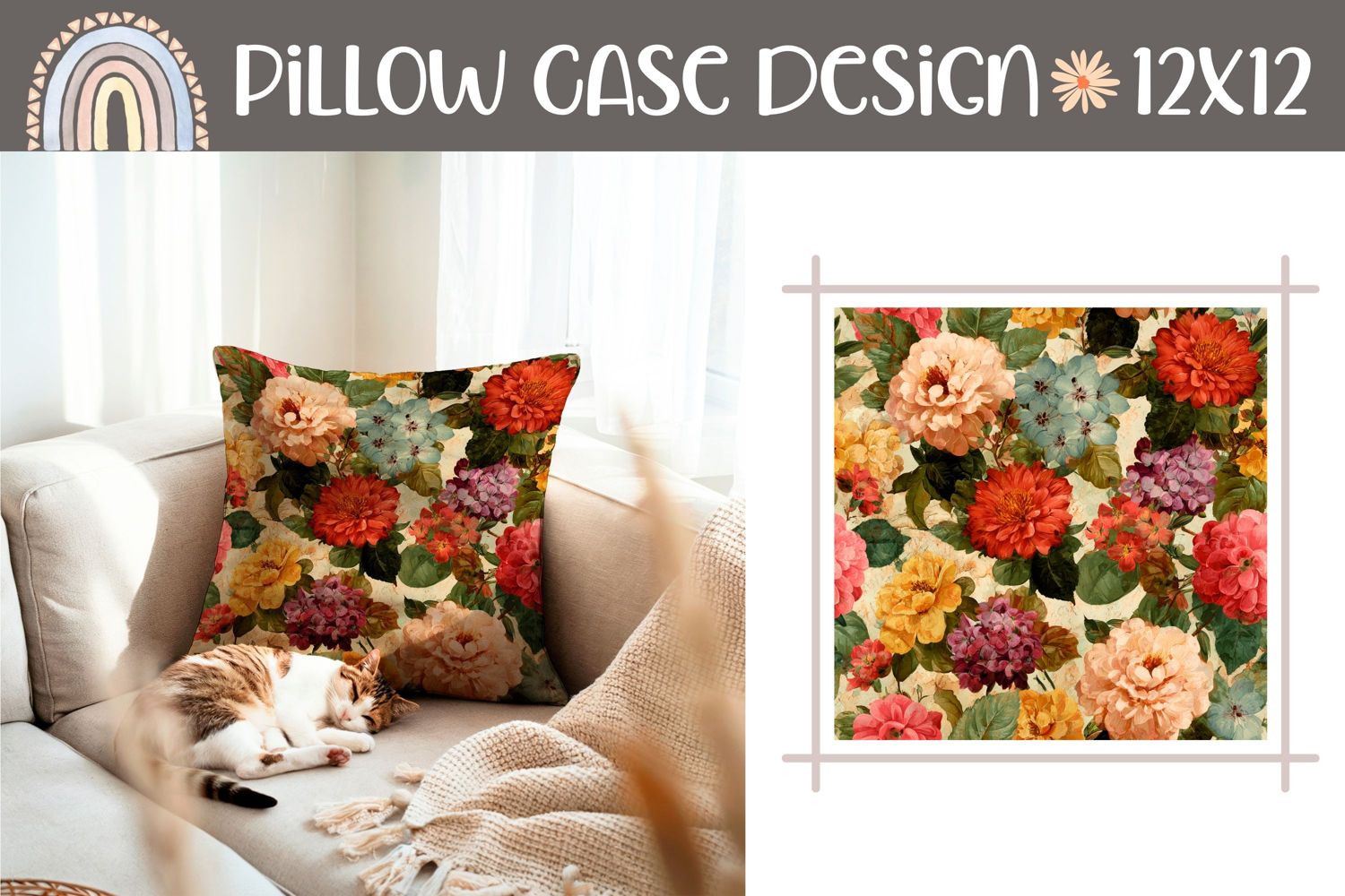 Cute Pillow Case Print, Vintage Flowers Pillow PNG example image 1