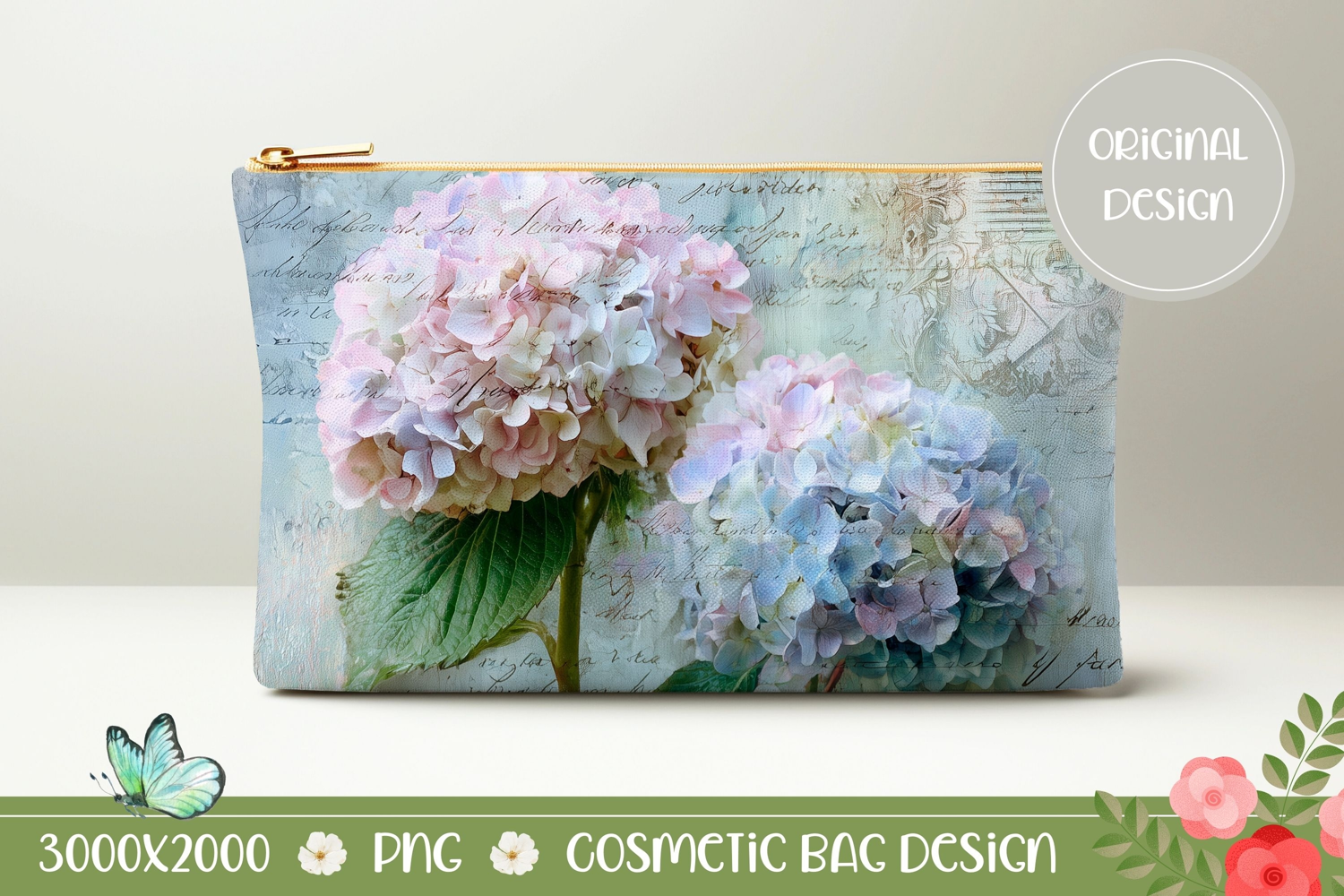 Vintage Flowers Cosmetic Bag Design, Hydrangea Cosmetic Bag