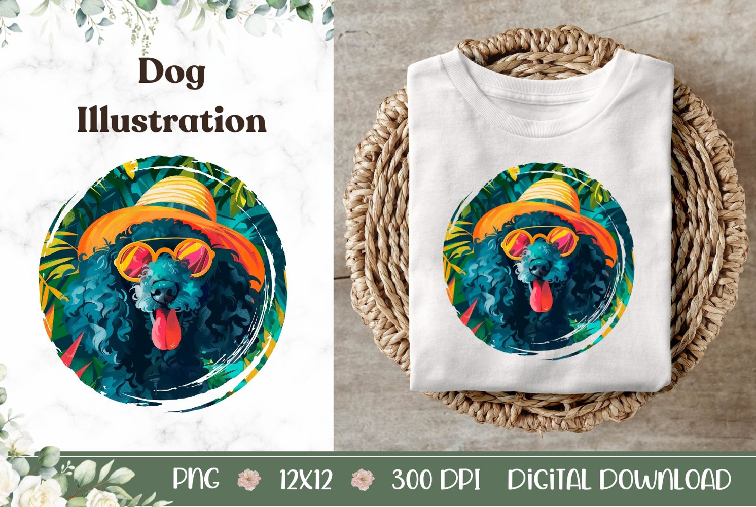Summer Poodle Illustration, Tropical Black Poodle Dog PNG example image 1