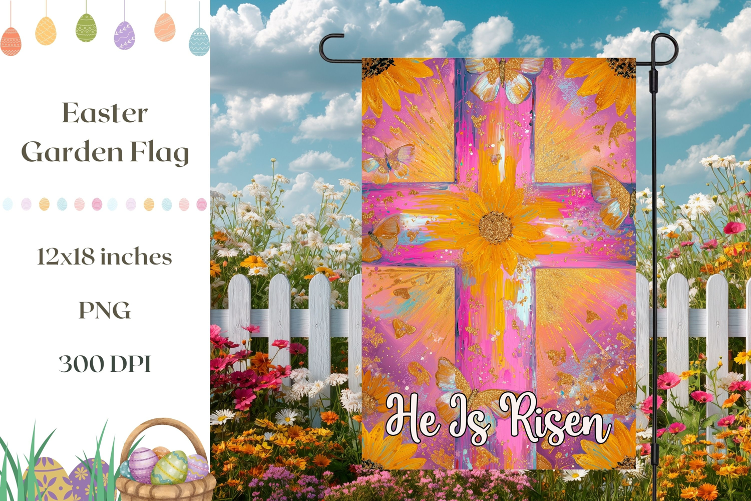 Happy Easter He Is Risen Png Easter Sublimation Design Spring Garden Flag Easter Garden Flag Christian Cross Png Floral Cross Sublimation Welcome Garden Flag Christian Garden Flag Religious Sublimation Easter