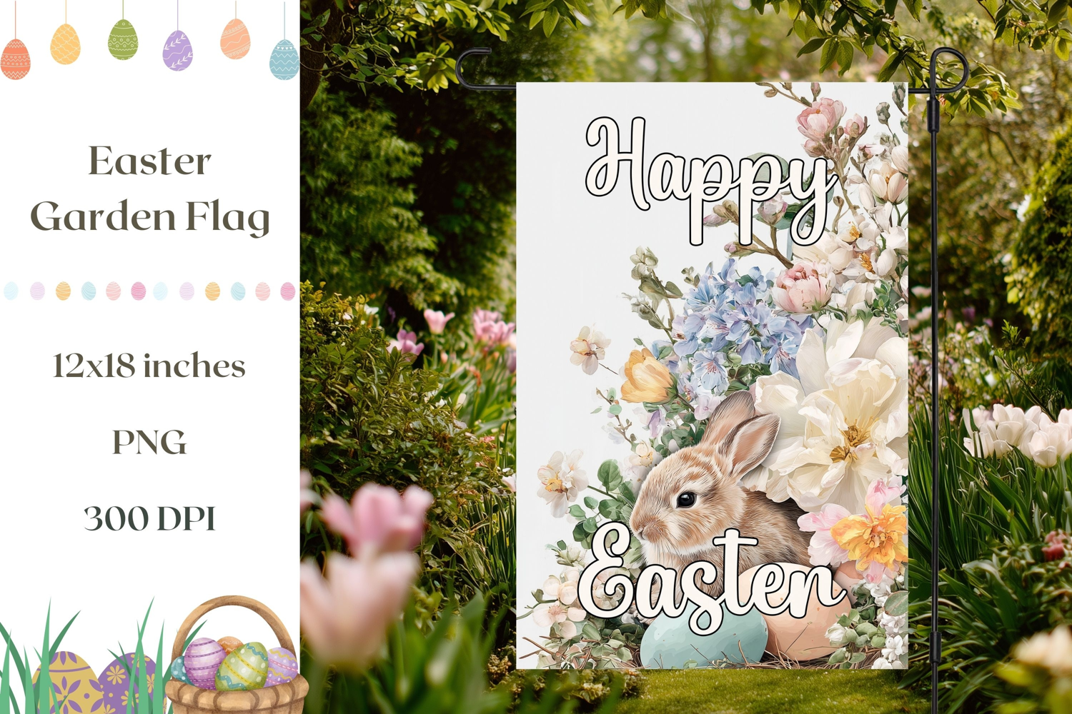 Easter Garden Flag, Floral Easter Eggs PNG, Easter Bunny PNG example image 1