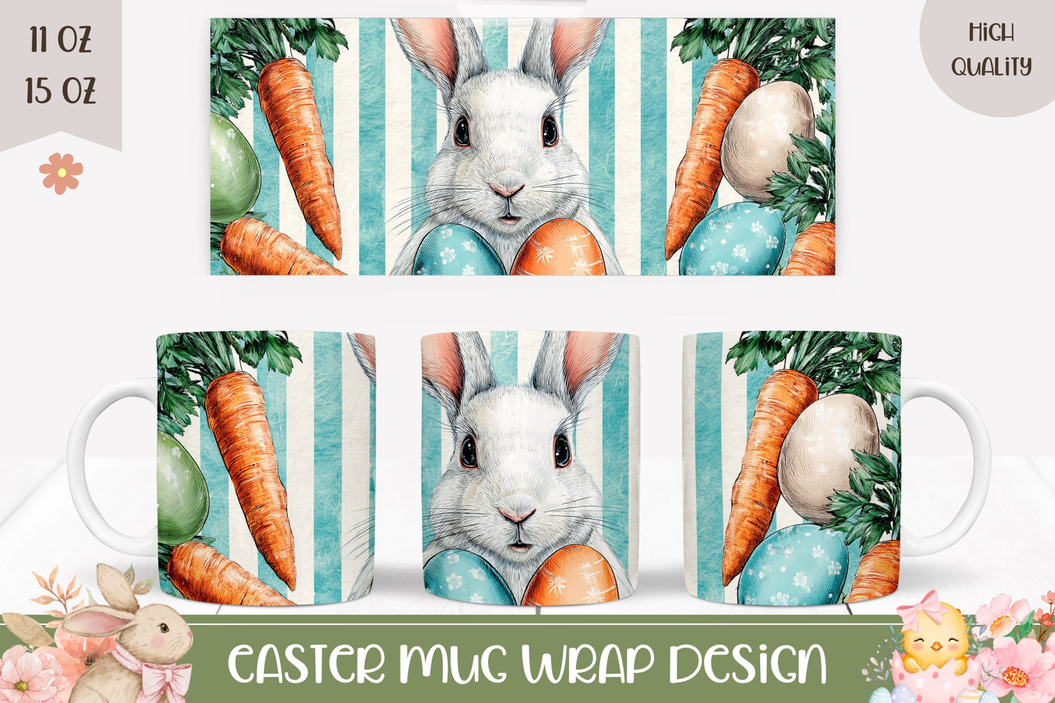 Easter Bunny Mug Wrap Design, Cartoon Carrot Mug Sublimation