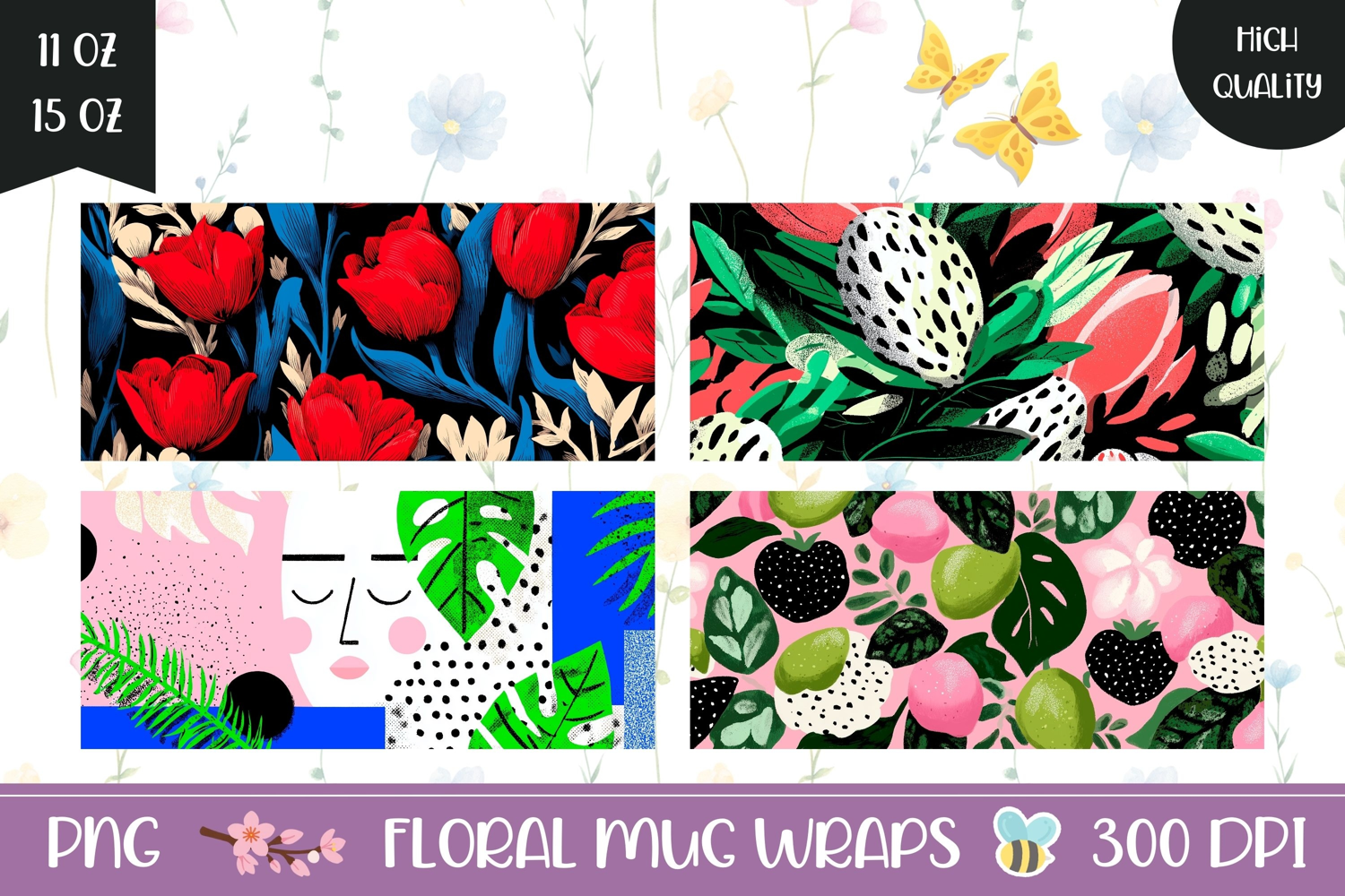 Abstract Flowers Mug Wrap Designs, Floral Mug Sublimation