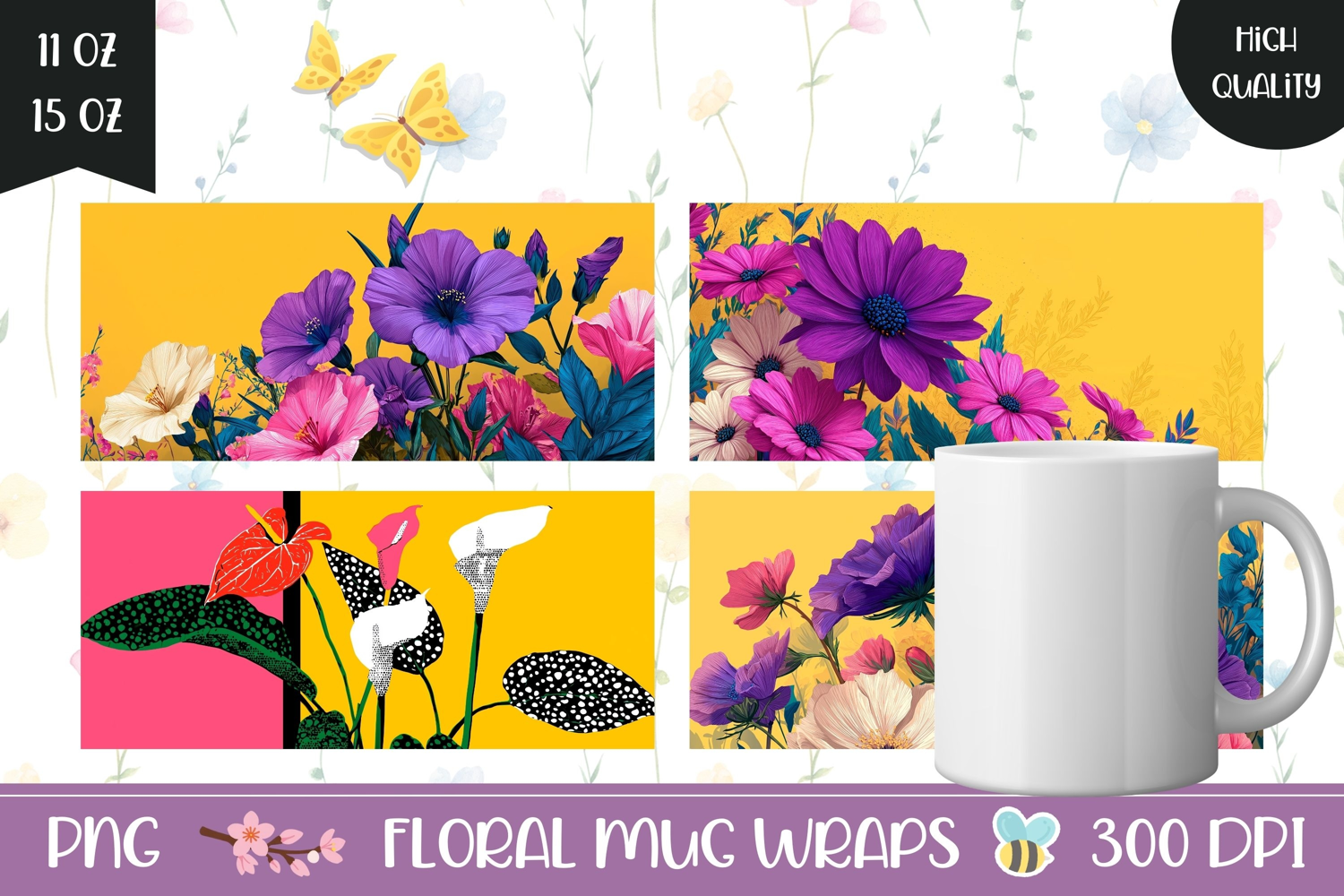 Purple Flowers Mug Designs, Floral Mug Sublimation PNG