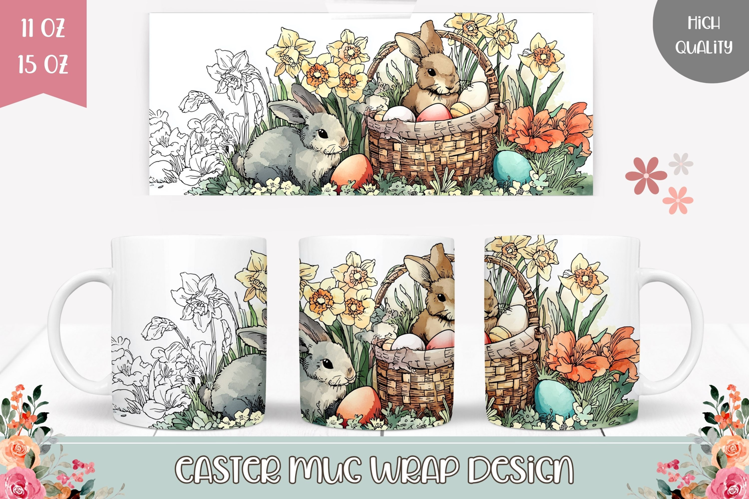 Floral Easter Basket Mug, Easter Bunnies Mug Wrap Design