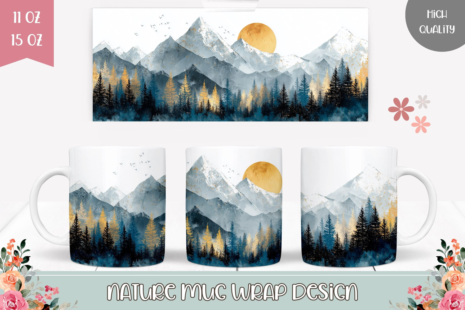 Mountains Mug Wrap Design, Forest Mug Sublimation Design