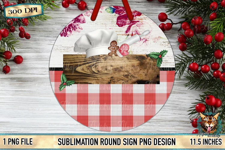 Welcome the warmth of the holidays into your kitchen with our enchanting Christmas Round Sign Design! This delightful digital design features a charming baker's hat, festive Christmas cookies, and a rolling pin, all set against a backdrop of half-wood floral print and a cozy red plaid tablecloth. The 11.5-inch size is perfect for MDF sublimation round sign blanks, and it even includes a wood plaque space for you to add your name or a heartwarming quote.