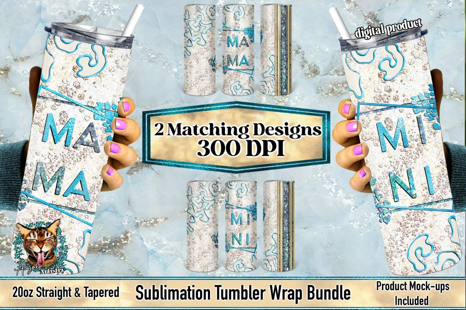 This is a peekaboo Mama and Mini Sublimation 20oz Skinny Tumbler Design Bundle for 20oz skinny tumblers, these are Mama and Mini Matching themed designs. Featuring different color variations of leopard print patterns, with glitter iridescent backgrounds. Although they can all be easily resized to fit other Sublimation tumbler and mug sizes.