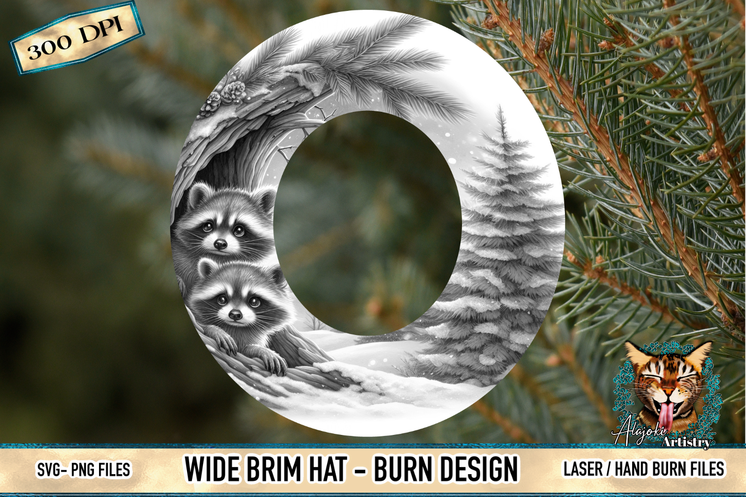 Create a stunning, rustic statement piece with this Raccoon Winter Wide Brim Hat Burn Design. Featuring two adorable raccoons nestled in a snowy woodland scene with pine trees and flowing feather details, this design is perfect for hat burning, laser engraving, and wood burning projects.