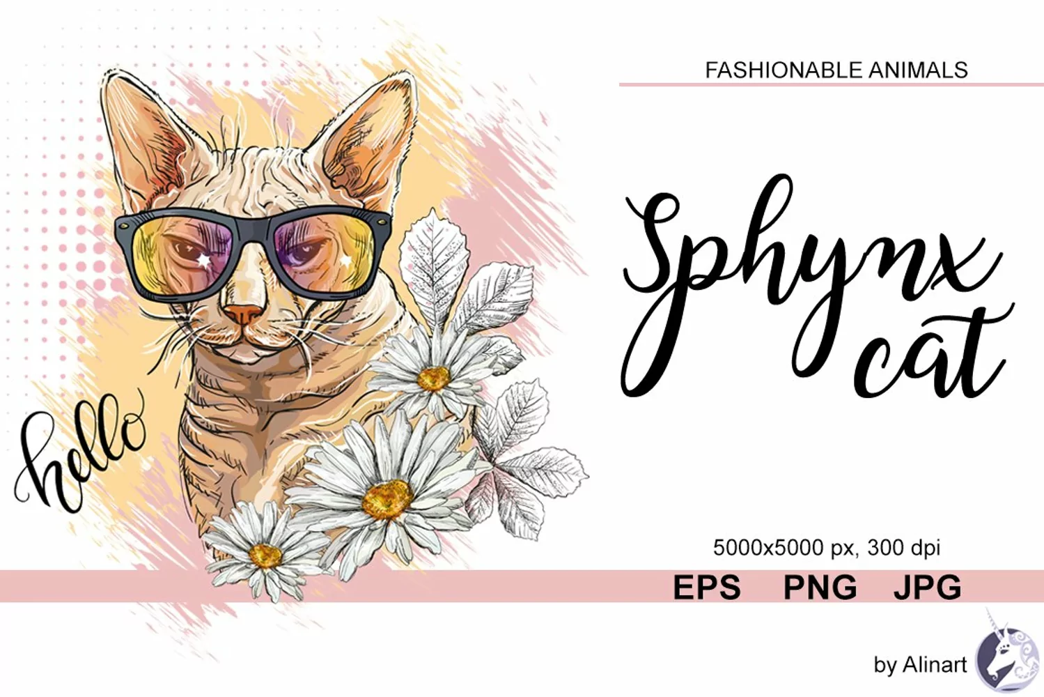 Funny and trendy illustration Cool Sphynx cat in flowers is perfect for decoration and design of clothes, pillows, mugs, stickers and more!